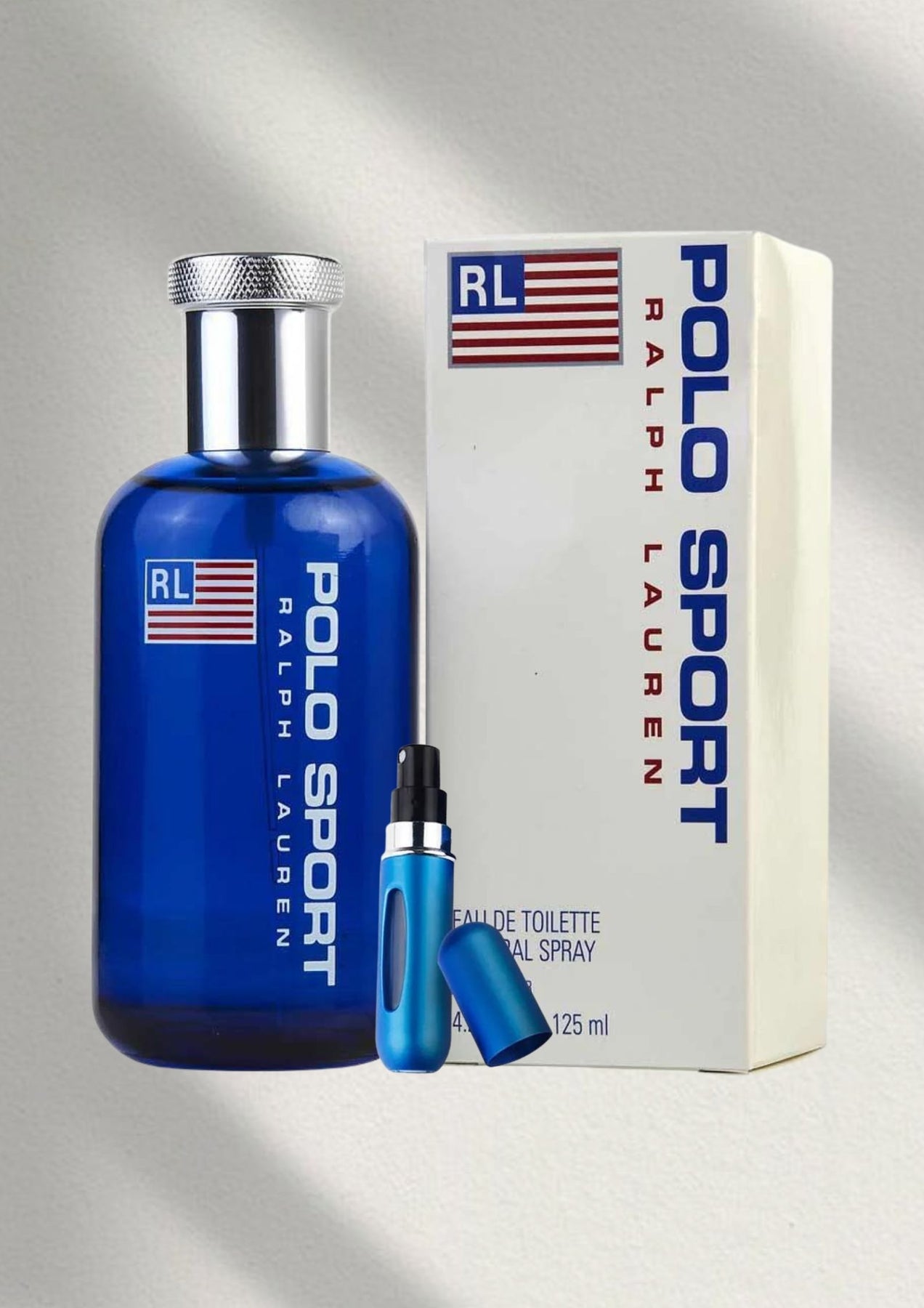 Polo Sport Ralph Lauren cologne bottle and packaging by ALESANDIE PARFUMS with blue glass and silver cap